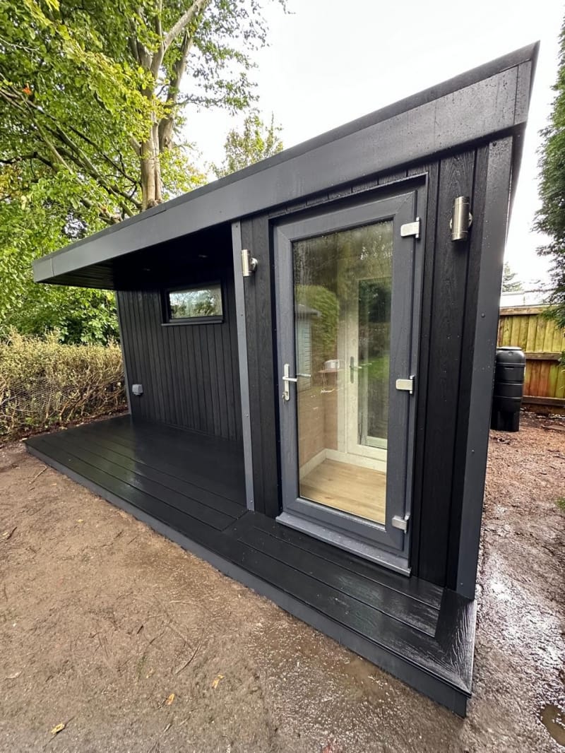 Standard Specification: Fibre Cement External Cladding, OSB Lined Interior Ready for Painting or Acoustic Treatment, 3 x Double Sockets, 2 x External Up/Down Lights, 1 x 6060 RGB LED Internal Ceiling Light with Remote, Switches & Consumer Unit, 2 x 0.9mW x 2.02mH Single Doors with Acoustic Glazing (Back to Back), 2 x 1.2mW x 0.75mH Opening Windows (Back to Back), High Grade Fully Insulated Interlocking Roof Panels, Full Foundation System, Laminate Flooring & Skirt Trims, Composite Decking Step to Front of Doors, Fully Isolated Room Within a Room Construction, & Onsite Installation